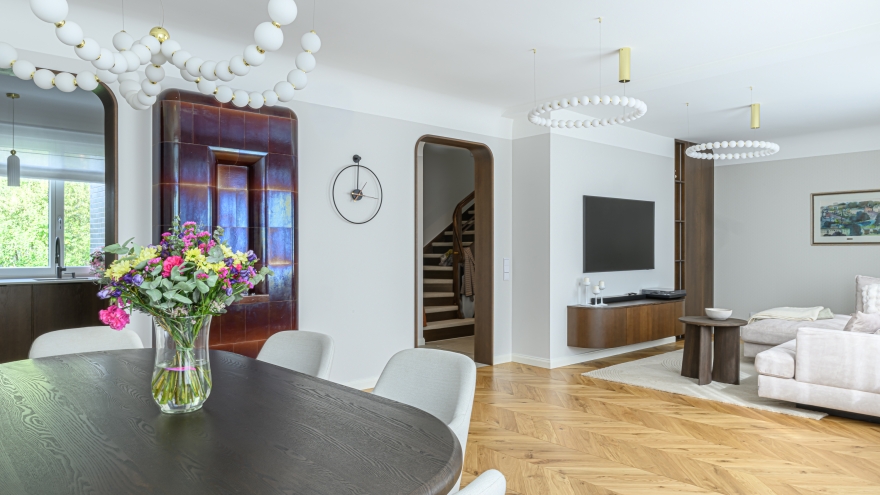 Valgusküllane, rahulik ja soe põhjamaises stiilis kodu üllatab kaunite puidunüanssidega, mis on läbivad kõikides ruumides. Samas on interjöör tänu suurtele akendele ja naturaalsele päevavalgusele kaunilt tasakaalus. Erinevatele puidutoonidele pakuvad kontrasti õhulised kardinad ja kaunid valgustid, hele mööbel ja vaibad.
